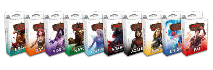 The decks will release in two waves. Chapter 1 features Kayo, Iyslander, Viserai, Dash, and Bravo, Flattering Showman. Chapter 2 introduces Azalea, Dorinthea, Fai, Enigma, and Arakni, Web of Deceit. Each deck contains 55 cards plus hero and basic cards, giving players a strong foundation to learn and compete.