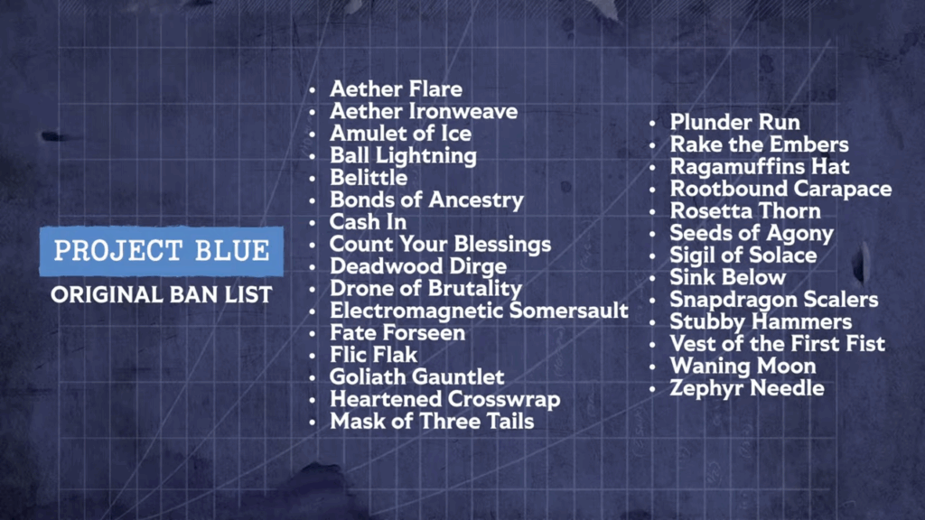Silver Age carries over the list of banned cards from its development name, Project Blue, in addition to adding three four new cards to the list: