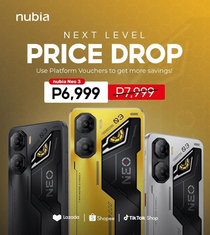 At the center of the sale is the nubia Neo 3 4G, now just ₱6,999 (down from ₱7,999). It features a 6.6-inch FHD+ 120Hz display, a 50MP AI dual camera, dual shoulder triggers for gaming, and a 6000mAh battery with 33W fast charging—making it a versatile pick for gaming, photography, and all-day entertainment.